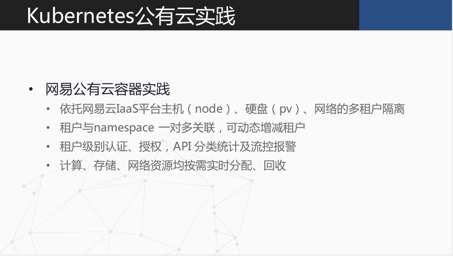 因为网易云本身提供有关 Node/PV 的服务,所以在这一块又和私有云有点不一样。因为像社区原生的 Kubernetes,它更多的是面向私有云市场。像很多公有云厂商,提供的 Kubernetes 服务,也是用户申请后,它给你一套完整的 Kubernetes 集群。这个集群是由用户自己来维护的。