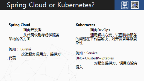 Kubernetes 更多是面向 DevOps,它是希望通过提供一个平台,一个通用性的方案把微服务中间需要处理的细节放在平台上解决。不用去关注服务发现和 DNS 这些东西,就比如说在 Spring Cloud 里面的服务发现。你需要代码去拿这些信息。
