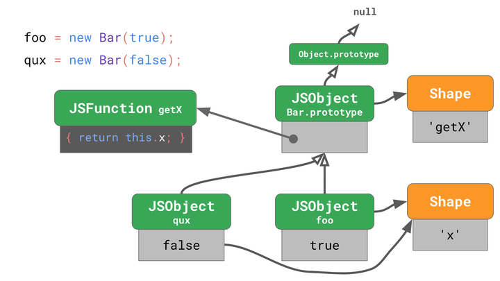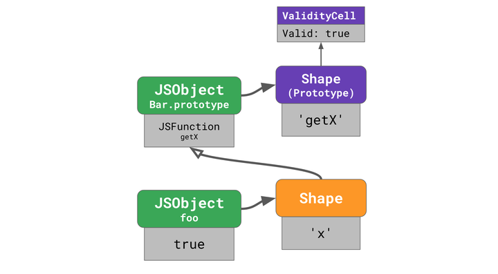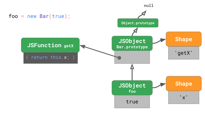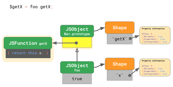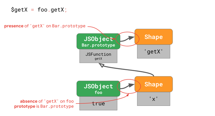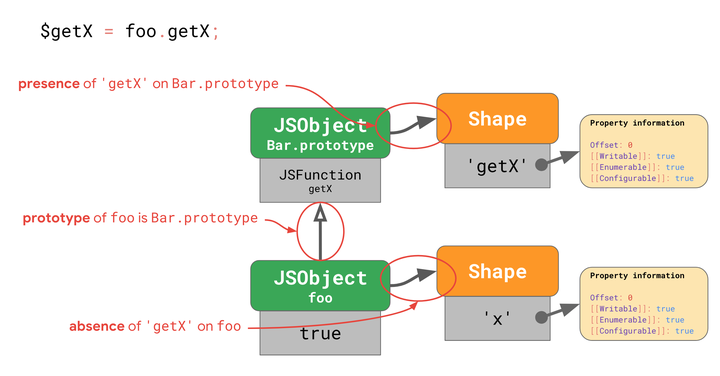 foo的 shape 不包含'getX'并且没有改变过。这意味着没有人通过添加或删除属性或通过更改其中一个属性来更改对象foo。foo的原型仍然是最初的Bar.prototype。这意味着没有人通过使用Object.setPrototypeOf()或通过赋予特殊的_proto_属性来更改foo的原型。Bar.prototype的形状包含'getX'并且没有改变。这意味着没有人通过添加或删除属性或更改其中一个属性来更改Bar.prototype。