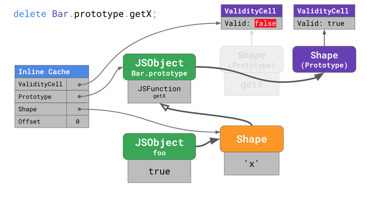 loadX 中的 inline cache 现在指向 Bar.prototype 的 ValidityCell。 如果你之后执行了类似于改变 Object.prototype(这是 JavaScript 中所有原型的根节点)的操作,则ValidityCell 将失效,且现有的 inline cache 会在下次命中时丢失,从而导致性能下降。