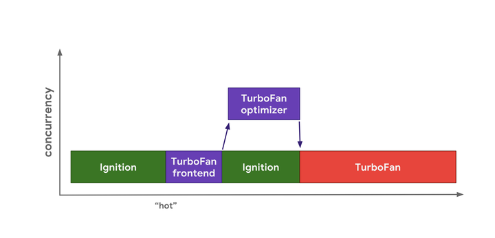 V8开始在 Ignition 解释器中运行字节码。从某些方面来看,代码是否足够 hot由引擎决定,引擎还负责调度 TurboFan 前端,它是 TurboFan 中负责处理集成分析数据和构建代码在机器层面表示的一部分。这部分结果之后会被发送到另一个线程上的 TurboFan 优化器被进一步优化。