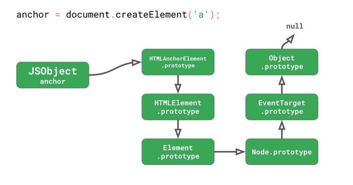 我们有一个 HTMLAnchorElement,在其上调用 getAttribute() 方法。这个简单的锚元素原型链就已经涉及6个原型!大多数有趣的 DOM 方法并不是直接存在于 HTMLAnchorElement 原型中,而是在原型链的更高层。