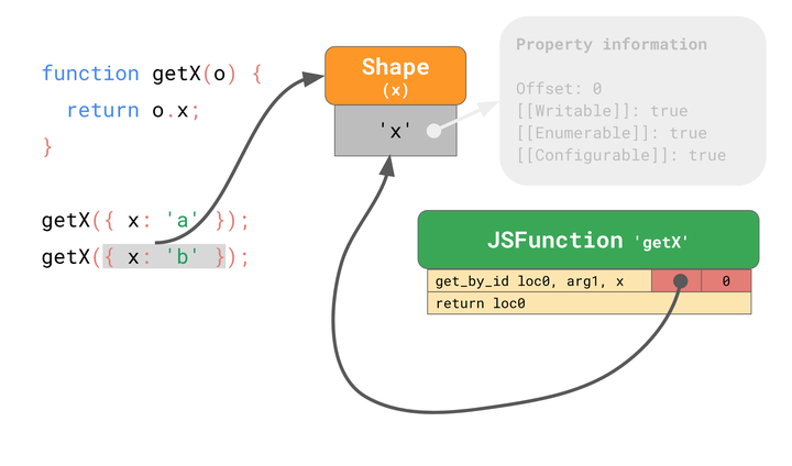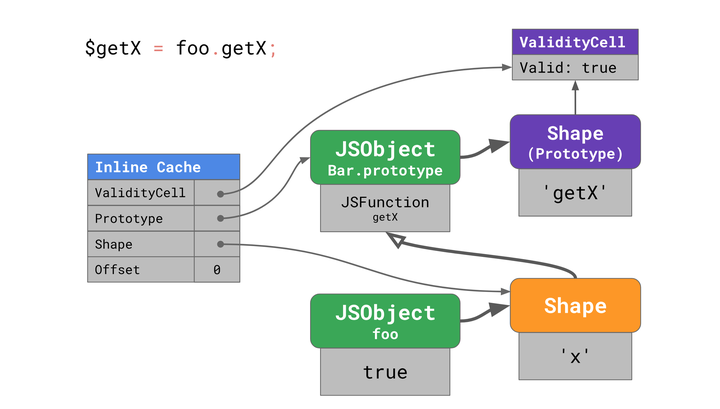 Shapes 可以实现称为 Inline Caches 或简称 ICs 的优化。通过组合,Shapes 和 ICs 可以加快代码中相同位置的重复属性访问速度。