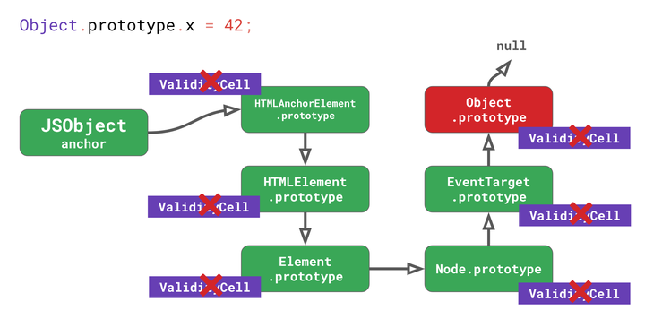 回到之前的 DOM 示例,这意味着对 Object.prototype 的任何更改不仅会使 Object.prototype本身的 inline cache 失效,而且还会使其下游的所有原型失效,包括EventTarget.prototype,Node.prototype,Element.prototype 等,直到 HTMLAnchorElement.prototype 为止。