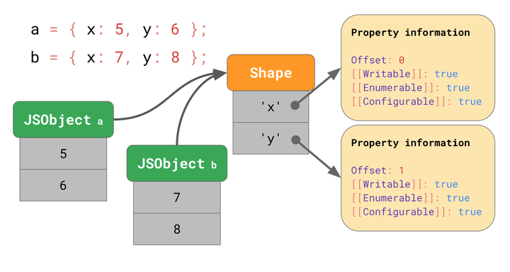 之前的文章解释了 JavaScript 引擎如何使用 Shapes 和 Inline Caches 优化对象属性加载。回顾一下,引擎将对象的 Shape 与对象值分开存储。