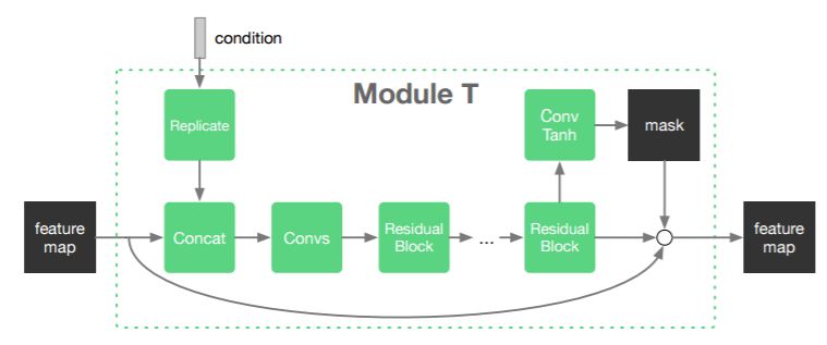 转换器模块 (T) 是该模型的核心模块。它根据输入条件 a_i 将输入特征表示转换成新的特征表示。转换器模块接收大小为 C×H×W 的特征图 f 和长度为 c_i 的条件向量 a_i。它的输出是大小为 C×H×W 的特征图 f_t。下图展示了模块 T 的结构。长度为 c_i 的条件向量 a_i 被复制到大小为 c_i×H×W 的张量,然后该张量与输入特征图 f 拼接。首先使用卷积层将通道数量从 C + c_i 减少到 C。之后,依次应用几个残差块,其输出用 f' 表示。使用变换后的特征图 f' 和具有 Tanh 激活函数的附加卷积层来生成尺寸为 H×W 的单通道特征图 g。随后该特征图 g 根据 g' = ( 1 + g ) / 2 的比例被重新缩放到范围 (0,1)。预测的 g' 就像 alpha 掩码或注意力层:它鼓励模块 T 只变换特征图中与特定属性变换相关的区域。最后,使用掩码 g'将变换后的特征图 f'与输入特征图 f 相结合,得到输出 f_t = g'×f' + ( 1-g' )×f。