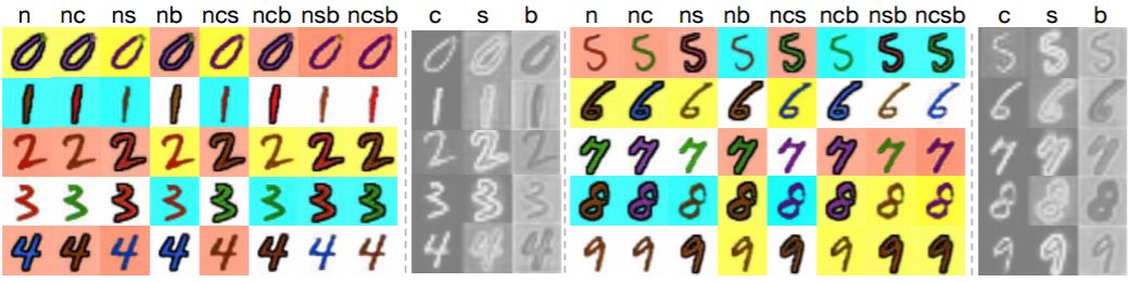 图 4:图像生成:在 ColorMNIST 数据集上的数字合成结果。注意,(n) 暗含对数字的约束,(c) 暗含颜色,(s) 暗含笔画类型,以及 (b) 暗含背景。由多个字母标记的列说明生成结果依赖于多个属性。例如:(ncs) 包含数字、颜色、笔画的约束。灰度图展示了由 T_i 模块(i∈{c,s,b})内在地生成的掩码。