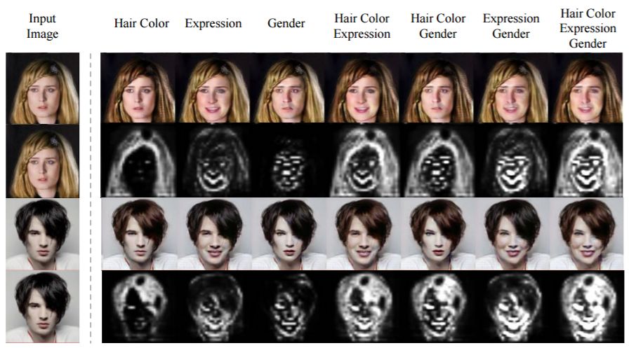 图 5:在 CelebA 数据集上的脸部属性迁移结果。