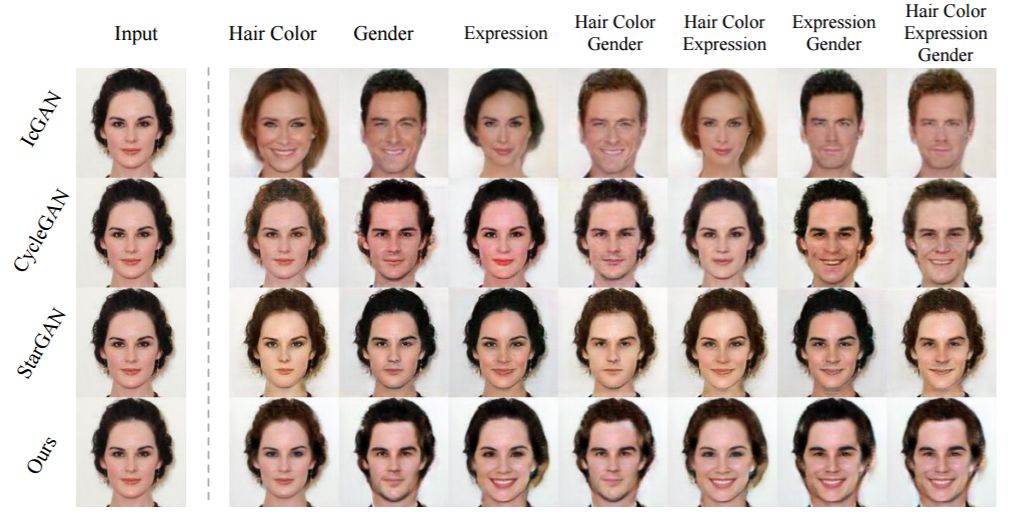 每个条件或条件类型有效地定义了一种生成或图像到图像的输出域(如人脸图像的表情域(笑)或性别域(男/女))。对于实际任务,我们希望控制数量巨大、可变的条件(如:生成微笑的人或棕色头发微笑的人的图像)。创建一个函数求解条件数目达到指数级的域非常困难。当下很多惊艳的图像转换方法只能将图像从一个域转换到另一个域。多域设定存在很多缺陷:(1)需要学习指数级的成对转换函数,计算成本很高并且在很多实际情况下并不可行;(2)在学习一个特定的成对映射时不可能利用其它域的数据;(3)成对的转换函数可能非常复杂,以建模差异巨大的域之间的转换。为了解决(1)和(2)中的问题,最近人们引入了多域图像(及语言)转换模型。代表源/目标域信息的固定向量可以用来作为单一模型的条件,以指导转换过程。然而,域间的信息分享在很大程度上是隐含的,函数映射变得极度复杂。