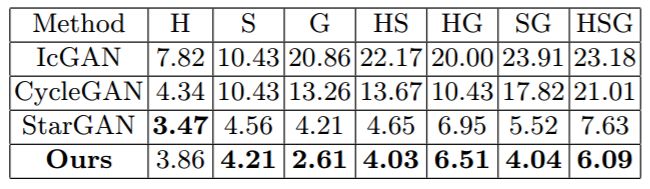 定量评估。我们训练了一个使用 ResNet-18 架构的模型来对 CelebA 数据集的发色、脸部表情和性别 [30] 分类。训练/测试集在其它实验中也是相同的。已训练的模型以 96.5%、97.9% 和 98.3% 的准确率对发色、性别和微笑分类。然后我们把这个已训练的模型应用到转换的图像上,该图像是在测试集上通过不同方法得到的。