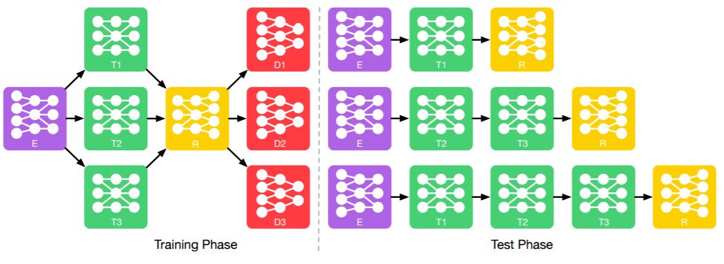 图 2 展示了图像转换模块在训练和测试阶段的完整架构。在训练阶段(图 2,左),编码器 E 和多转换器模块 T_i 连接,每个 T_i 进一步和重构模块 R 连接,以生成转换后的图像。有多个判别器模块 D_i 连接到重构器上,以将生成图像从真实图像中分辨出来,并对相应的属性做出预测。所有的模块拥有相同的接口,即 E 的输出、R 的输入、T_i 的输入和输出有相同的形状和维度。这允许模块进行集成,以在测试时构建更复杂的架构,如图 2 所示。