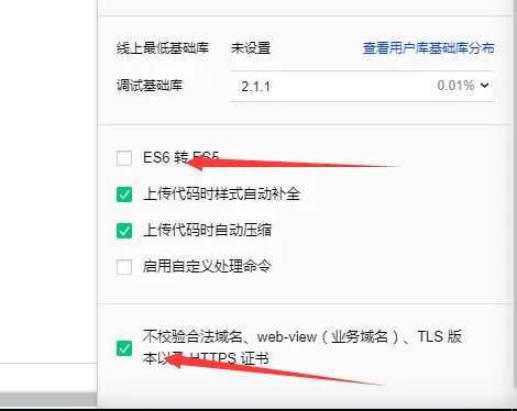 开发者自测:注意要将开发者工具关闭ES6 转 ES5,不然wepy编译会报错,如果需要请求域名或者需要用到web-wiew域名,后台未设置安全连接,打开工具的设置(不校验合法域名、web-view(业务域名)、TLS 版本以及 HTTPS 证书)