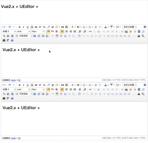 vue-ueditor-wrap组件是完全独立的。你甚至可以在上面使用v-for指令一次渲染 99个 兔斯基(不要忘记添加key值)。