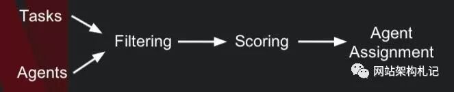 这个 scheduling 算法的大致思路如上图所示,scheduler 通过已知的 tasks 信息,以及所管理的服务器当前的状况(图中称为 agent),首先过滤(filtering)出可行的 agent。然后系统给各个 server 计算出一个匹配分数,最后deploy container 到最高分的一个 agent。