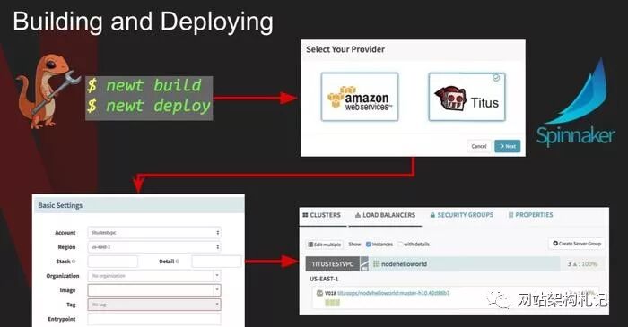 Netflix 有一个内部工具 newt,用来开发和部署用。 newt 通过命令行调用 CI 工具 Spinnaker 。 Spinnaker 可以选择是要 deploy 到 AWS EC2 的一个新的 vm 上,还是通过 Titus deploy 一个 container。