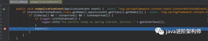 从这个图我们看到了许多和spring有关的东西,还发现了一个重要的接口,那就是ApplicationListener.要能敏锐的发现这个关键的接口,首先还是要对spring有一定了解,这个就是spring的事件机制(event).什么是事件机制呢?就比如监听spring容器初始化完成.那我们就定位到这行日志的位置,往下debug