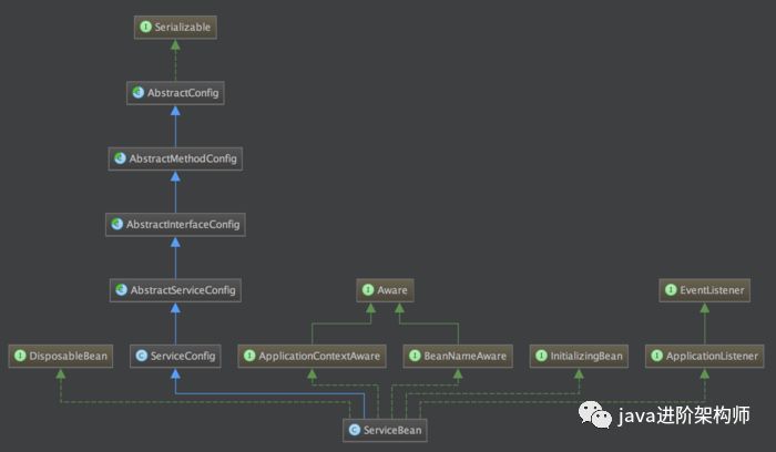 我们利用编译器的搜索文本功能,定位到了ServiceBean这个类,这个类是干嘛的?好,我假设我也不知道,既然不知道,那我们来看一下他的继承体系图