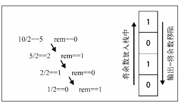 10的二进制就是:1010,下面通过栈的方式编写10进制转2进制的函数:function divideBy2(decNumber) {