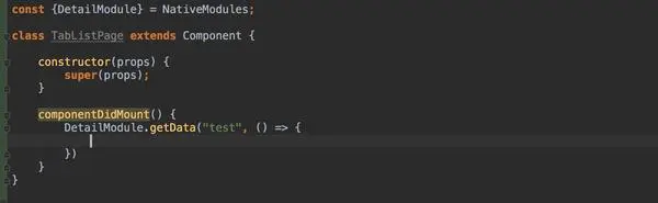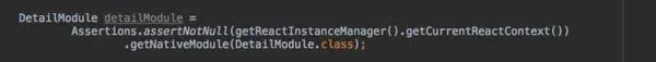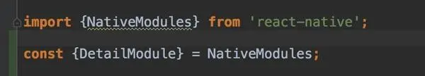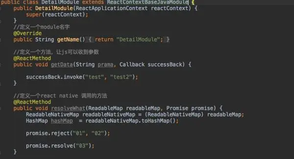 如上图,是MainReactPackage 内部实现,MainReactPackage是官方的类,其中关联了很多NativeModule,Module中你可以通过@ReactMethod注解,指定一个方法为JS可以调用的方法,如下图的DetailModule,便是继承了NativeModule的JAVA端实现类,在js中引入。