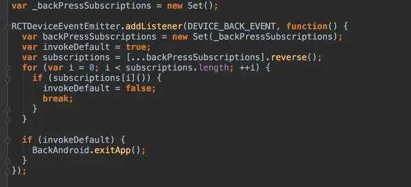 "hardwareBackPress"的监听。如下图所示,监听中判断全局Set表中的callBack,倒序循环判断,是否有callback,callback是否返回true,如果都没有,就调用exitApp。