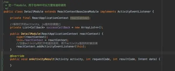 - 如下图,通过继承ActivityEventListener,用ReactApplicationContext添加监听,可以方便的在module中监听activity返回。网上说的用消息阻塞队列的做法就算了吧。
