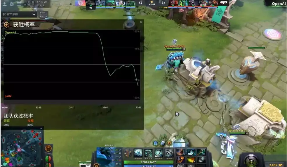 当然,人类并不认为此时 AI 还能占据优势。在 37 分钟,paiN 经济已经领先了 9000。到 40 分钟,OpenAI 在击杀了人类两个英雄后选择了第三次打 Roshan,不过此时人类职业玩家似乎已经掌握了人工智能的套路。