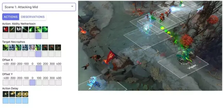 每一个 bot 的神经网络包含一个单层的、拥有 1024 单位的 LSTM,观察游戏的局势然后做出相应的行为。下图这个互动演示就是可以让你理解每个 bot 是如何做出指令的,这些画面就是 Dota 2 的 API 所观察到的。