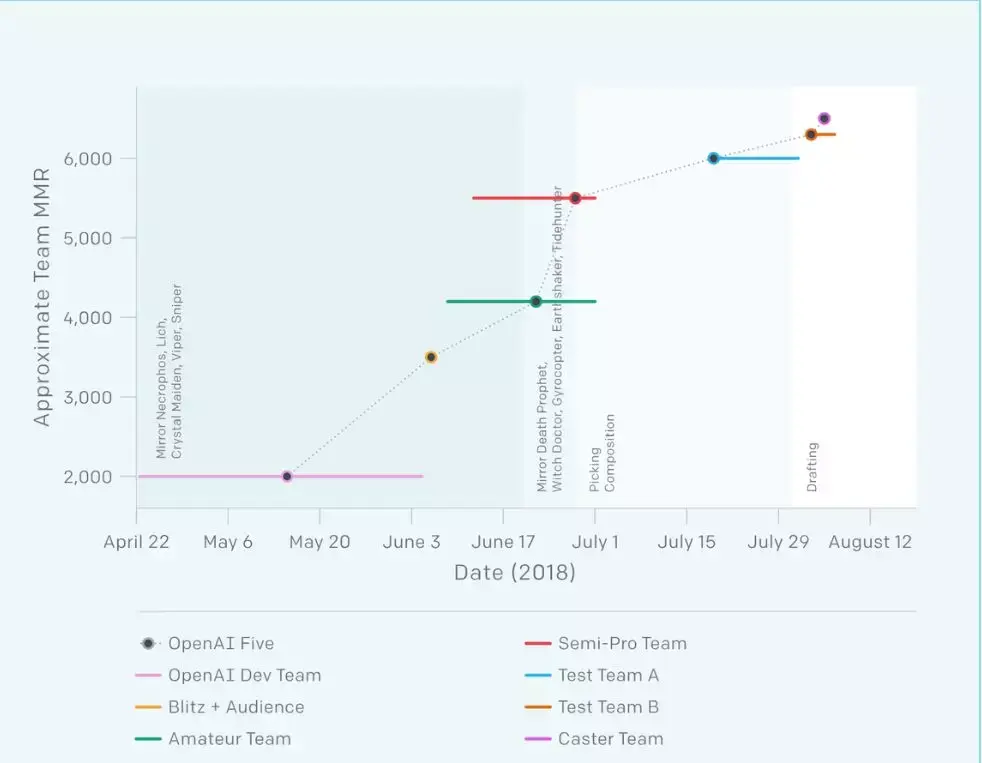 所以在 6 月-8 月的时间里,OpenAI 开始逐步地解决这些问题。同时,他们也宣布了下一步计划:在 8 月 5 日,邀请实力超过全世界 99.95% 玩家的(前)专业选手来对 AI bot 进行基准测试。