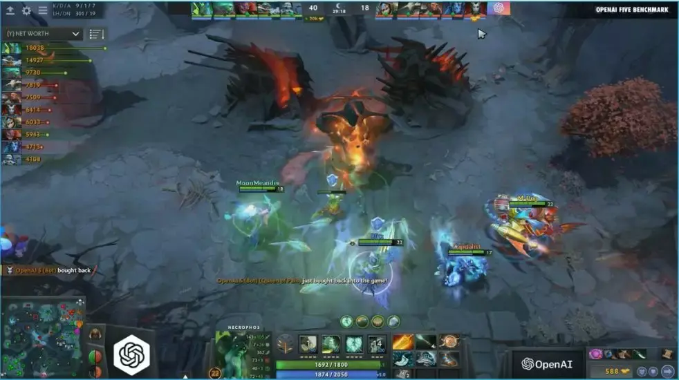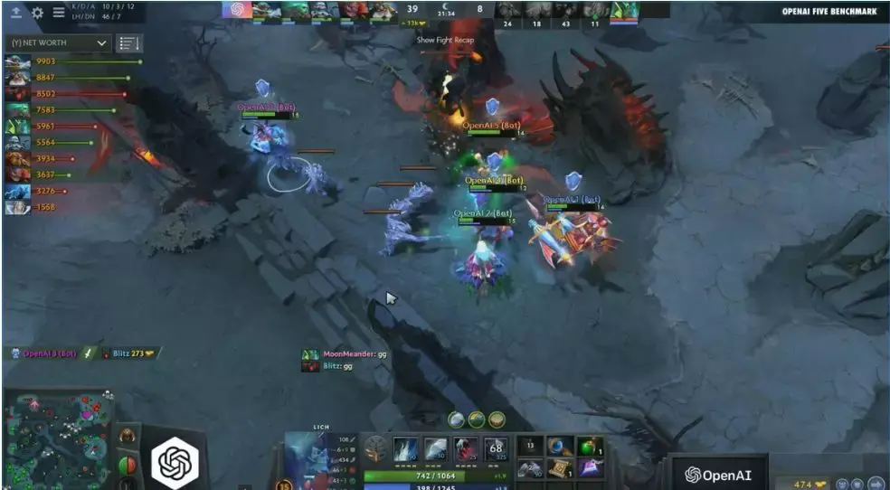后面的十分钟里,人类鲜有高光表现,除了影魔完成一次双杀外,OpenAI 是压着人类打,在第 21 分钟破了两路,又在高地以 0 换 4 的代价完成一波小团灭,人类打出 GG(Good game,表示投降),人头比数 8:39。