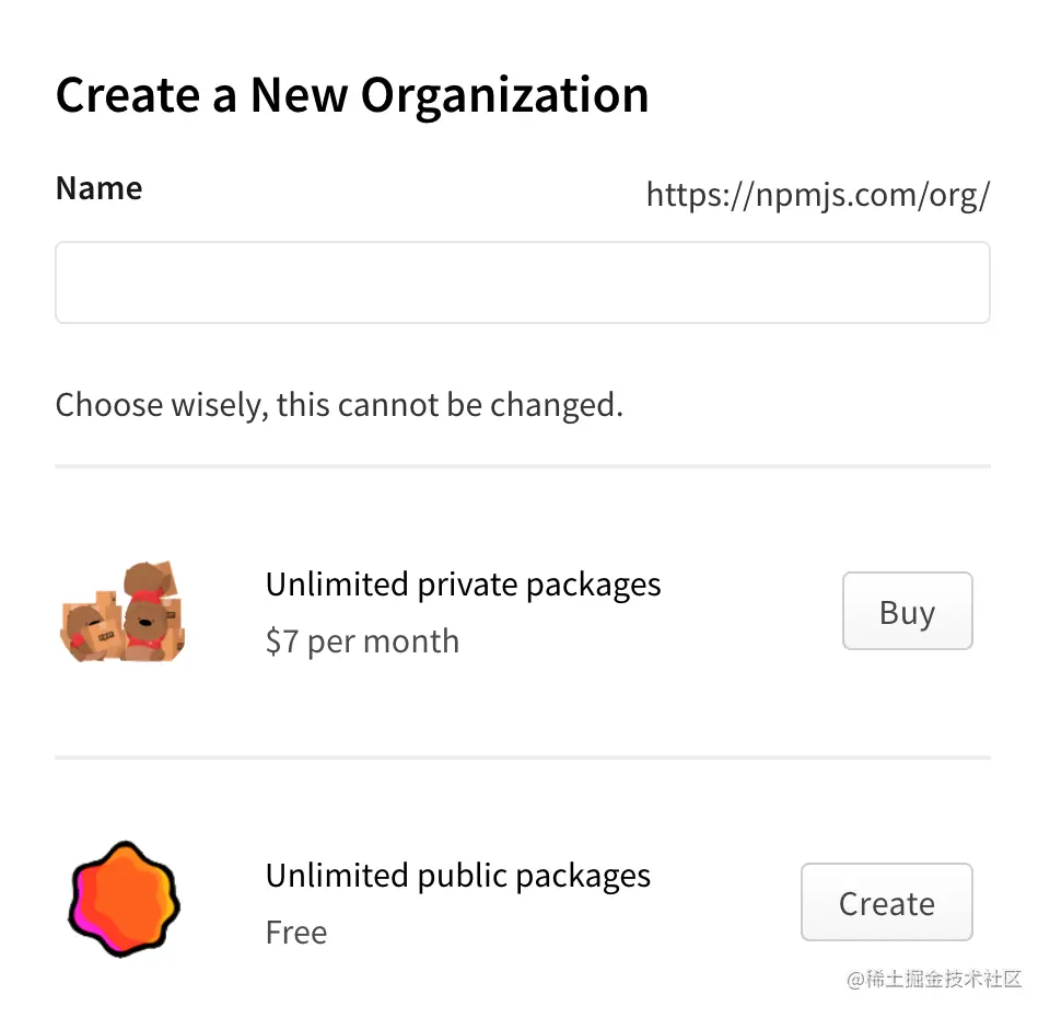 发布public库免费且无限制,发布private库需要收费7$/mon,填写好自己的组织名称,如abc,这里不需要添加@符号