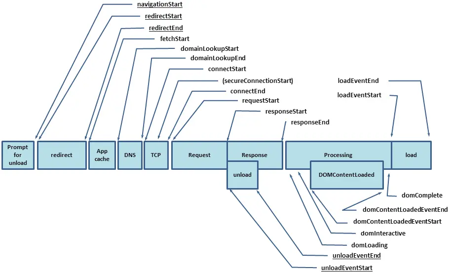 对象包含延迟相关的性能信息。属性 含义 -- navigationStart 准备加载新页面的起始时间 unloadEventStart 如果前一个网页与当前网页属于同一个域名,则返回前一个网页的unload事件发生时的Unix毫秒时间戳。如果没有前一个网页,或者之前的网页跳转不是在同一个域名内,则返回值为0。 unloadEventEnd 如果前一个网页与当前网页属于同一个域名,则返回前一个网页unload事件的回调函数结束时的Unix毫秒时间戳。如果没有前一个网页,或者之前的网页跳转不是在同一个域名内,则返回值为0。 redirectStart 如果发生了HTTP重定向,并且从导航开始,中间的每次重定向,都和当前文档同域的话,就返回开始重定向的timing.fetchStart的值。其他情况,则返回0 重定向开始 redirectEnd 如果发生了HTTP重定向,并且从导航开始,中间的每次重定向,都和当前文档同域的话,就返回最后一次重定向,接收到最后一个字节数据后的那个时间.其他情况则返回0 重定向结束 fetchStart 如果一个新的资源获取被发起,则fetchStart必须返回用户代理开始检查其相关缓存的那个时间,其他情况则返回开始获取该资源的时间 domainLookupStart 返回用户代理对当前文档所属域进行DNS查询开始的时间。如果此请求没有DNS查询过程,如长连接,资源cache,甚至是本地资源等。 那么就返回 fetchStart的值 domainLookupEnd 返回用户代理对结束对当前文档所属域进行DNS查询的时间。如果此请求没有DNS查询过程,如长连接,资源cache,甚至是本地资源等。那么就返回 fetchStart的值 connectStart 返回用户代理向服务器服务器请求文档,开始建立连接的那个时间,如果此连接是一个长连接,又或者直接从缓存中获取资源(即没有与服务器建立连接)。则返回domainLookupEnd的值 (secureConnectionStart) 可选特性。用户代理如果没有对应的东东,就要把这个设置为undefined。 如果有这个东东,并且是HTTPS协议,那么就要返回开始SSL握手的那个时间。 如果不是HTTPS, 那么就返回0 connectEnd 返回用户代理向服务器服务器请求文档,建立连接成功后的那个时间,如果此连接是一个长连接,又或者直接从缓存中获取资源(即没有与服务器建立连接)。则返回domainLookupEnd的值 requestStart 返回从服务器、缓存、本地资源等,开始请求文档的时间 responseStart 返回用户代理从服务器、缓存、本地资源中,接收到第一个字节数据的时间 responseEnd 返回用户代理接收到最后一个字符的时间,和当前连接被关闭的时间中,更早的那个。同样,文档可能来自服务器、缓存、或本地资源 domLoading 返回用户代理把其文档的 "current document readiness" 设置为 "loading"的时候 domInteractive 返回用户代理把其文档的 "current document readiness" 设置为 "interactive"的时候. domContentLoadedEventStart 返回文档发生 DOMContentLoaded事件的时间 domContentLoadedEventEnd 文档的DOMContentLoaded 事件的结束时间 domComplete 返回用户代理把其文档的 "current document readiness" 设置为 "complete"的时候 loadEventStart 文档触发load事件的时间。如果load事件没有触发,那么该接口就返回0 loadEventEnd 文档触发load事件结束后的时间。如果load事件没有触发,那么该接口就返回0 DNS时间 = domainLookupEnd - domainLookupStart