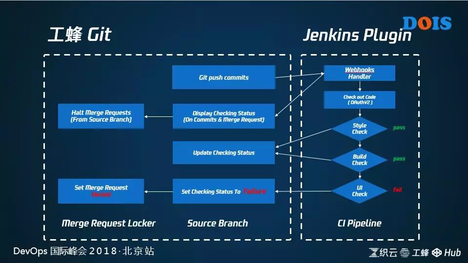 同样和代码库集成的还有自动化扫描和测试流程,流程就不仔细说了,也是通过松耦合的方式来实现自动化调用。当扫描检测失败的时候自动阻拦合并请求,从代码级别上拦截特性分支的合入。