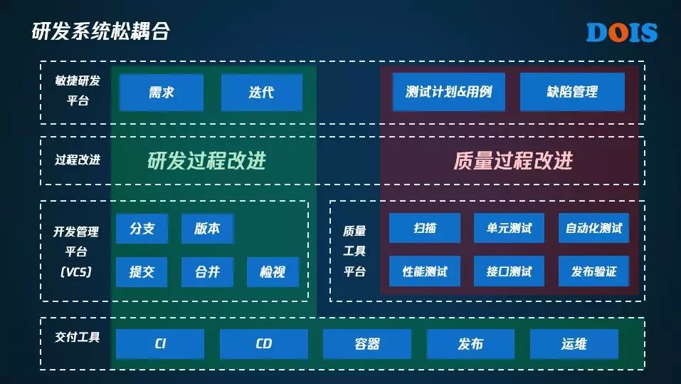 接下来看看DevOps在系统之间是怎样互相桥接的。DevOps关注的两块过程改进,一个是研发的过程,一个是质量的过程。严格意义来说研发闭环是可以包含多个质量过程闭环的。那么在这两个流程的闭环中,都会涉及到若干种不同的工具。