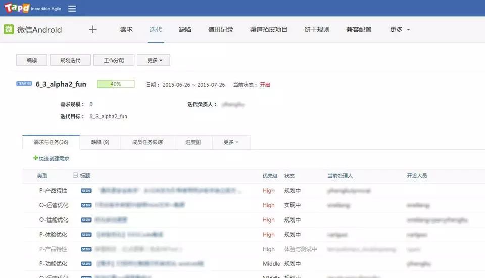 这是微信项目在TAPD一个迭代的需求页面