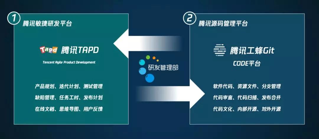 研发管理部负责了两大研发平台,TAPD是腾讯的敏捷研发平台,承载了全公司的产品规划、迭代、测试计划、任务分配等等;Code是腾讯的源码管理平台,现在是工蜂,负责了全腾讯的代码库、资源文件、分支、审查、合并发布到内部开源的研发链路。