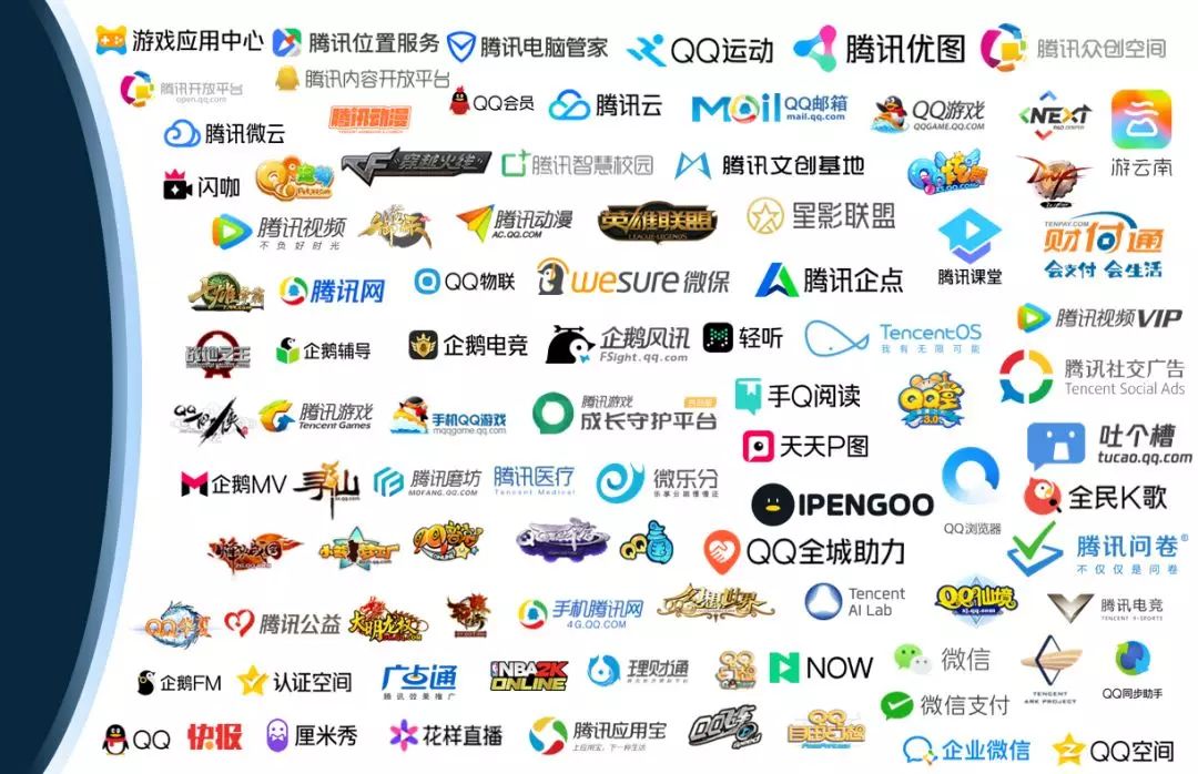 我们在以前的分享也提到过,腾讯有种类繁多的广泛的产品线,产品数量多。下图列出了一部分,更多的产品是没能列上的。