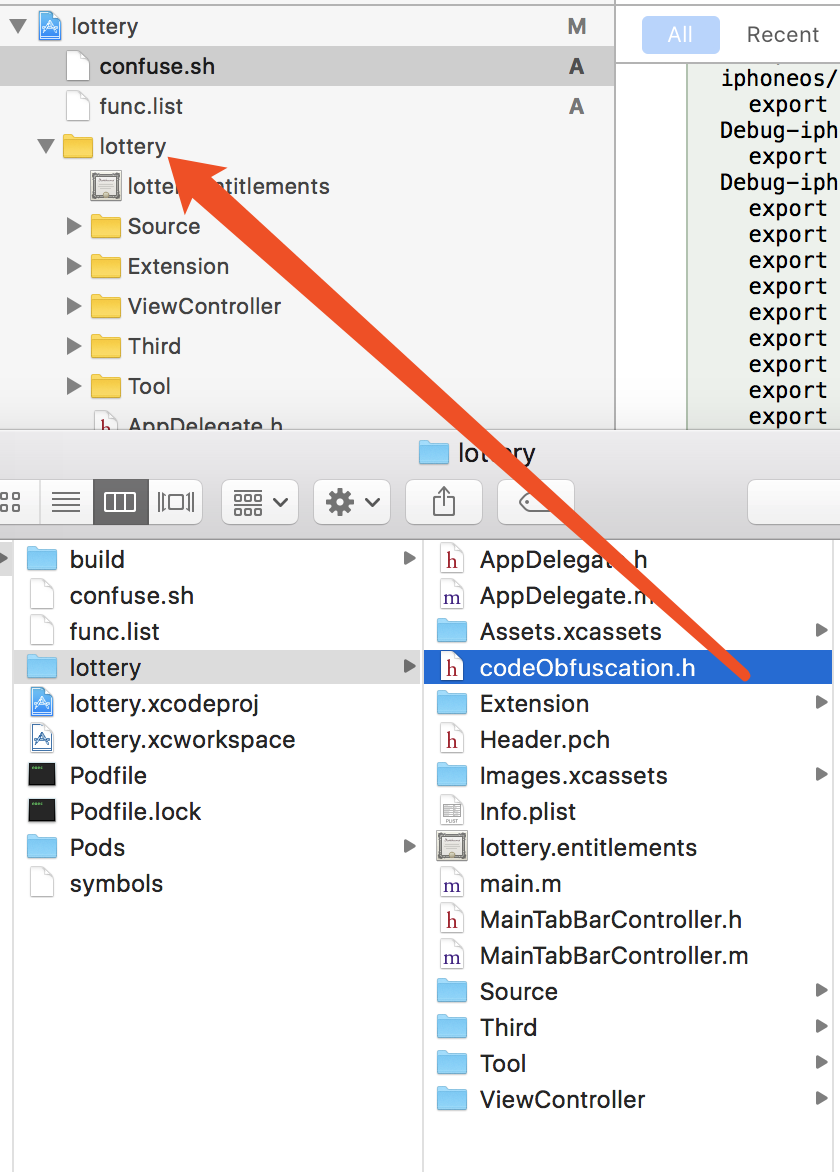 进行 command + B 编译之后,在项目目录下,会有一个 codeObfuscation 文件;将它拖进项目中