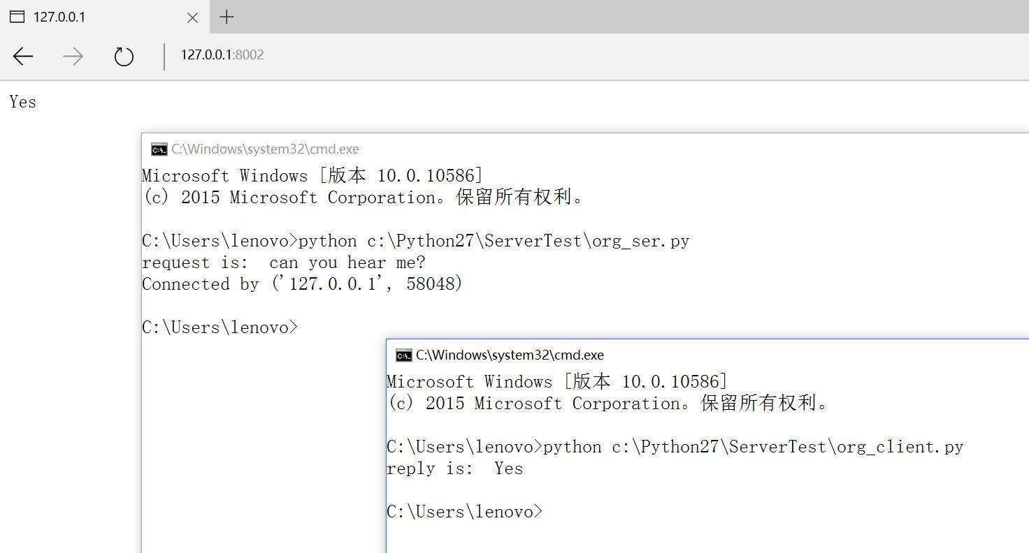 中间图是服务器运行图,最下面是客户端运行图,可以看出客户端向服务器请求的内容为:request = 'can you hear me?',而客户端得到的反馈是“Yes”。