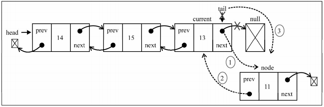 // previous 应当是插入node的前一个节点,current应该是被插入node的后一个节点