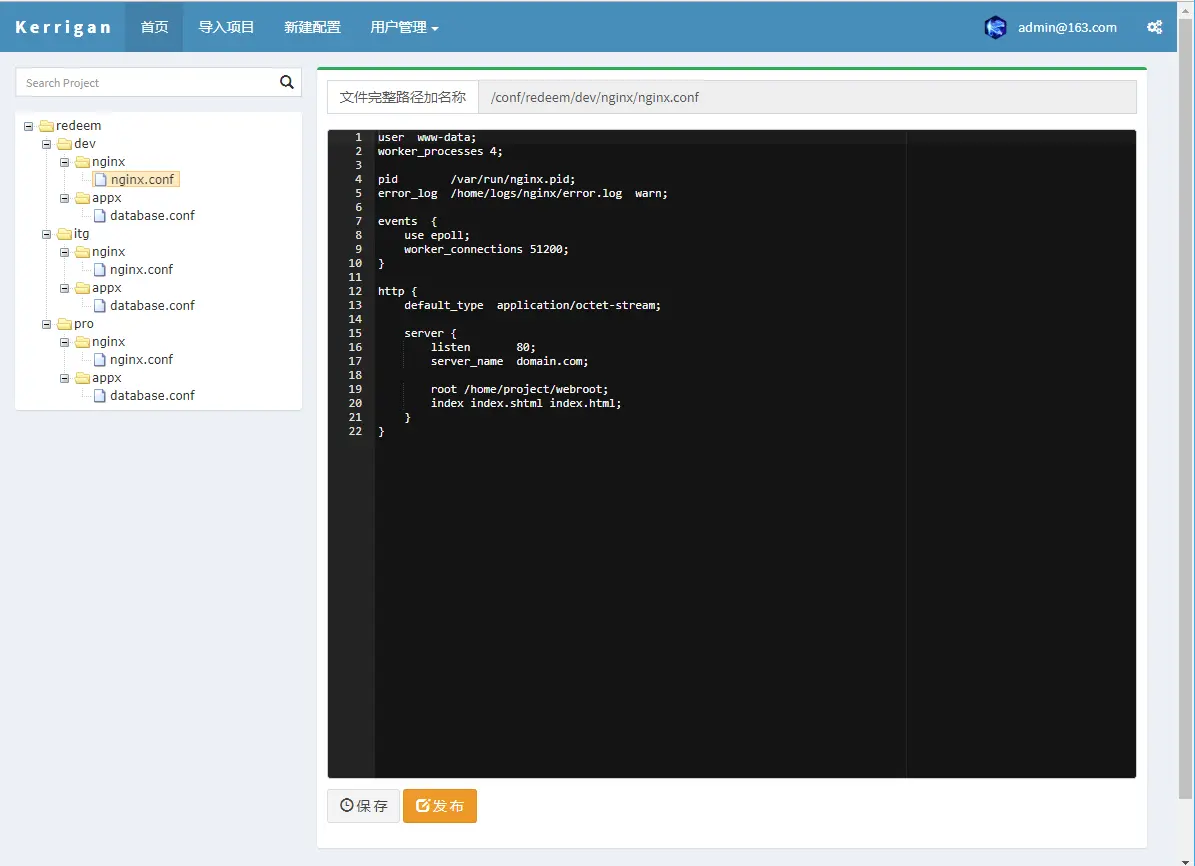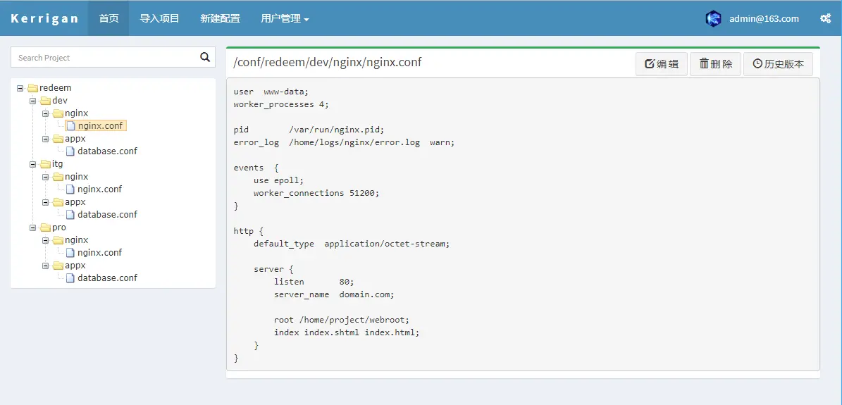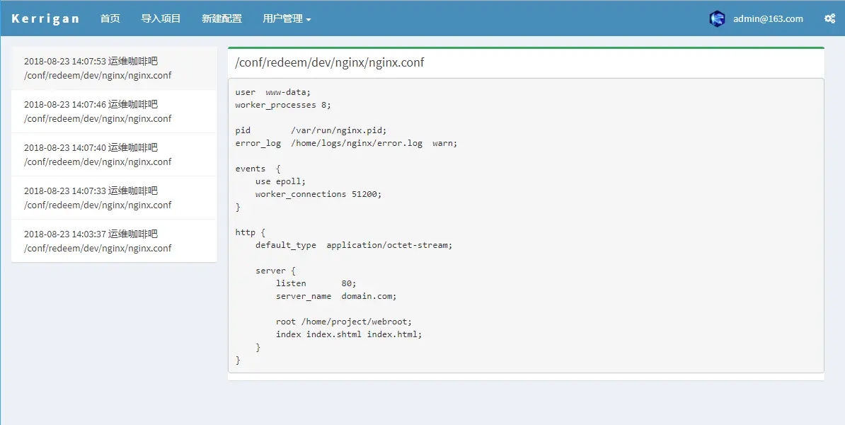 总不能所有的配置文件更新都通过命令行的方式吧?为了方便管理,花了三天(真的是三天)写了个WebUI,命名为Kerrigan,能够实现目录树,在线查看配置、修改配置、查看配置更新历史等实用功能