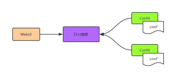 - 配置中心整体采用C/S的模式,用Etcd作为服务端来存储数据,Confd作为客户端去Etcd取数据更新