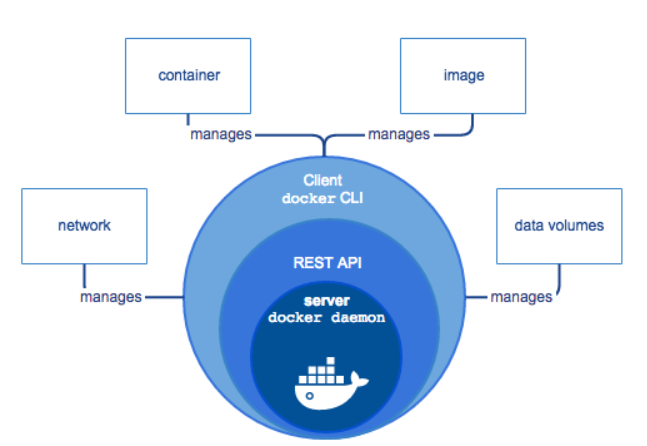 - docker CLI 实现容器和镜像的管理,为用户提供统一的操作界面,这个 客户端提供一个只读的镜像,然后通过镜像可以创建一个或者多个容器。(container),这些容器可以只是一个RFS(Root File System),也可以是一个包含了用户应用的RFS。容器在docker Client中只是一个进程,两个进程是互不可见的。用户不能与server直接交互,但可以通过与容器这个桥梁来交互,由于是操作系统级别的虚拟技术,中间的损耗几乎可以不计。