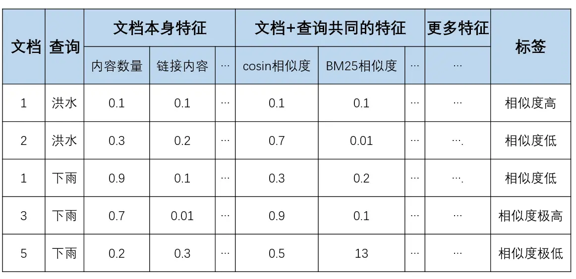 查询+文档共同抽离为特征向量,即上一节图中的任一行都可以是一个训练样本。有特征向量,有标签,这就是一个多分类问题。