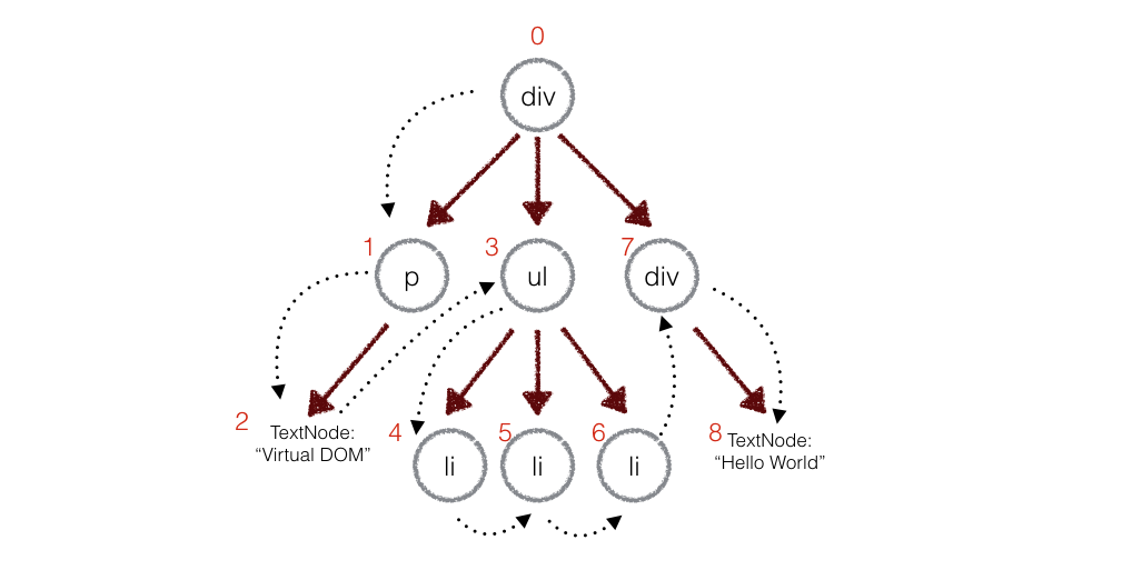 在实际代码中,会对新旧两棵树进行一个深度优先的遍历,这样每个节点都会有一个唯一的标记,然后记录差异
