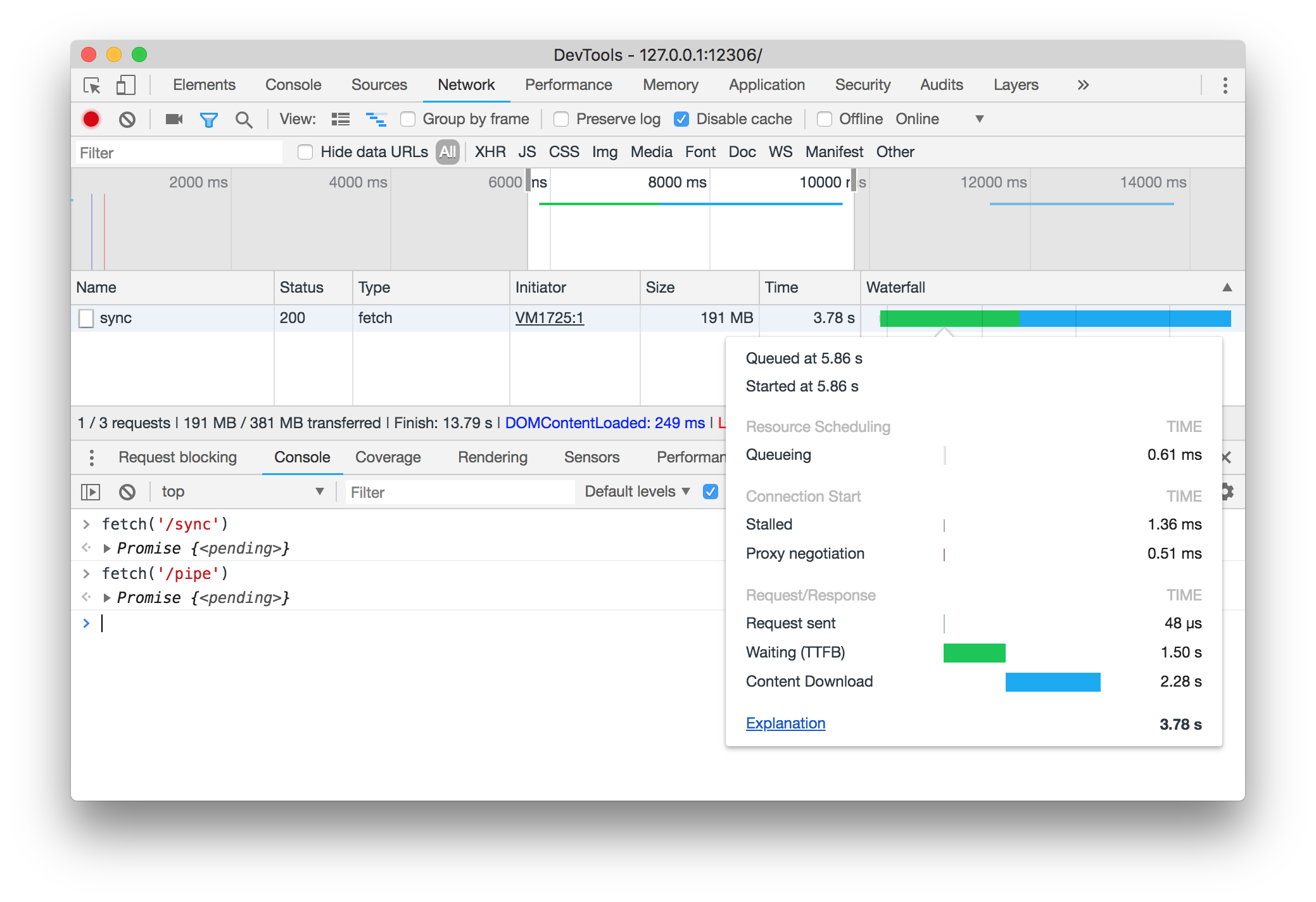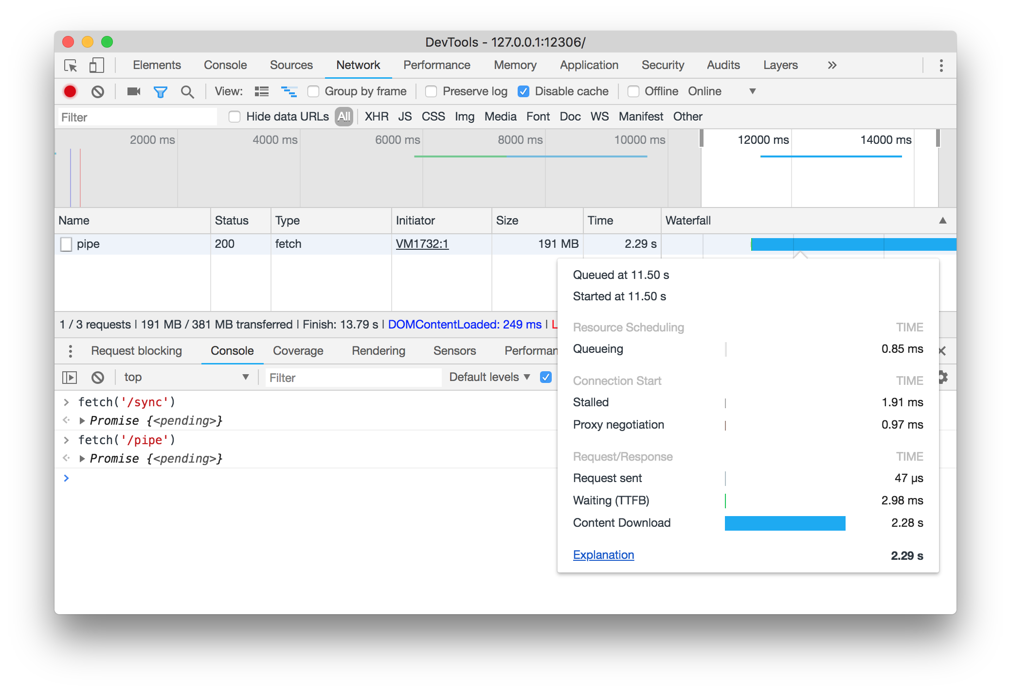可以看出在下行传输的时间相差无几的同时,使用readFileSync的方式会增加一定时间的Waiting,而这个时间就是服务器在进行文件的读取,时间长短取决于读取的文件大小,以及机器的性能。