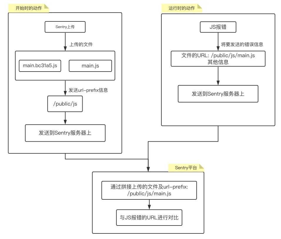 当Sentry服务端收到source-map时,是通过你上传时的url-prefix信息,与source-map文件以及运行时的js文件,产生对应。流程图如下: