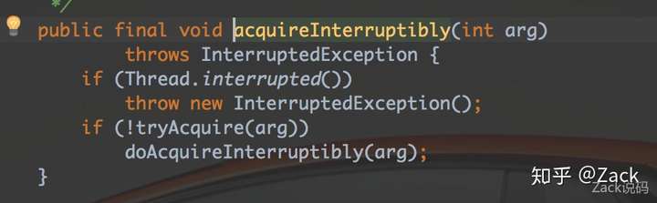 检查线程是否被中断并尝试获取锁,失败则进入队列。线程中断会退出队列。 流程基本和acquire()相同。不同点就是,acquireInterruptibly()在自旋获取过程中如果线程是中断的,那么就会抛出异常退出流程,并且放弃锁。