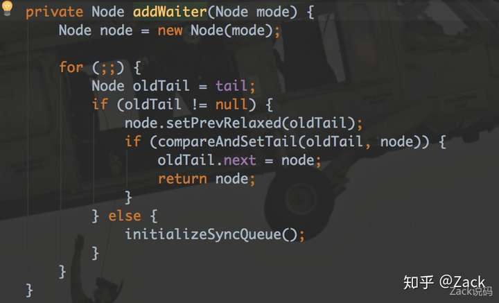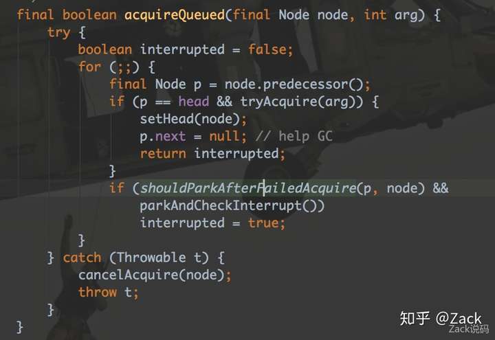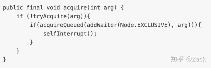 然后把节点丢到acquireQueued()中执行。该方法其实就是自旋尝试获取锁或阻塞线程(子类实现决定)。