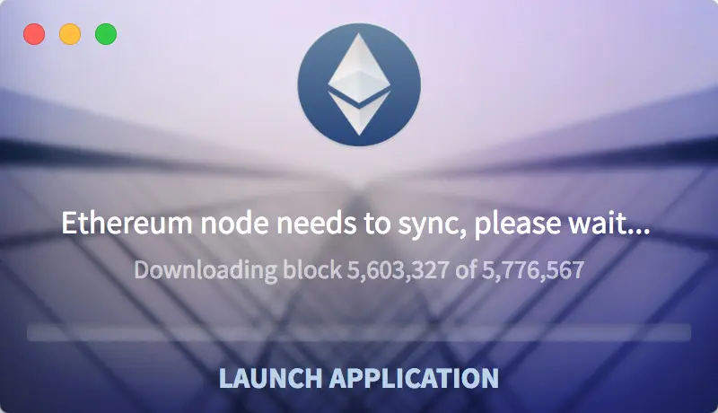 当安装完成之后,该应用程序会自动下载以太坊区块链的所有节点,将其存储在本地。截止到我写这篇文章的时候,一共有577万个区块,这份数据大概有2G的大小,所以可能会消耗比较长的下载时间。