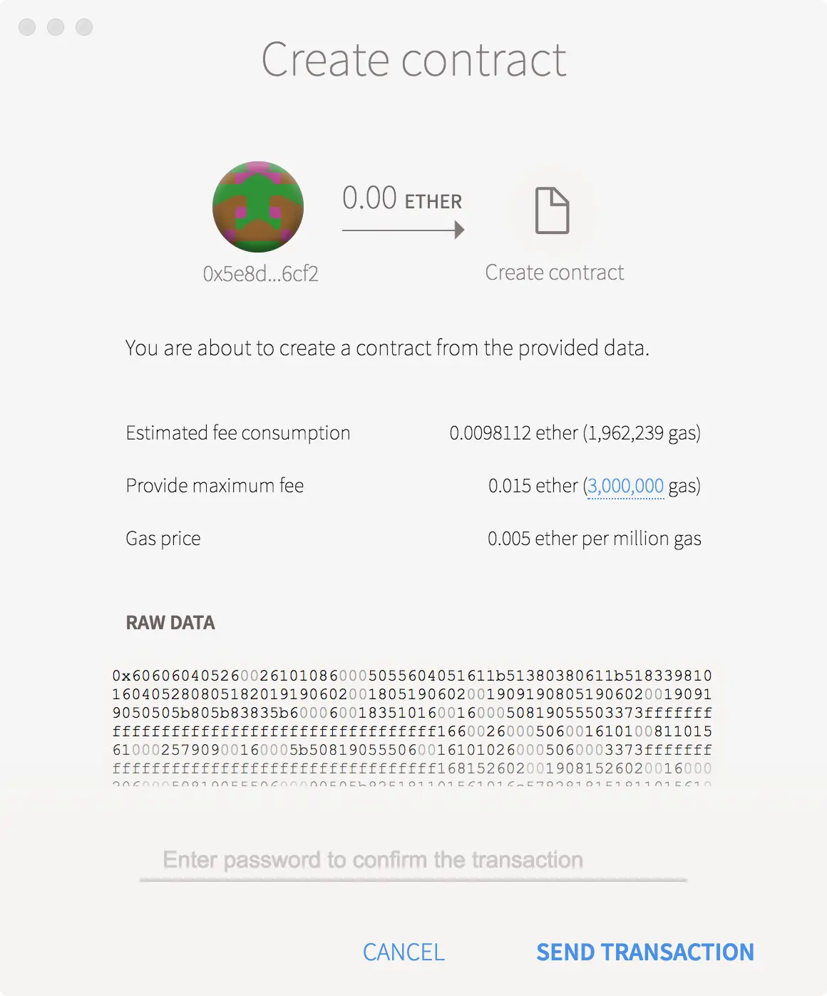这里我选择了「SINGLE OWNER ACCOUNT」,点击「Create」之后会进入创建合同页面。它需要你输入账号密码进行交易。我们输入密码之后点击「SEND TRANSACTION」进行交易。